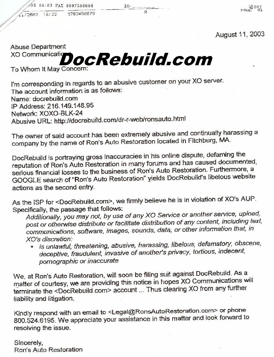 August 11, 2003 Ron alleges he will SOON file a suit Updated Sept 4, 2004: I can wait, but I wont hold my breath. Over two years have passed and based upon his previous repeated promises to deliver, I am not optomistic about him keeping his word or being on any timely schedule. Perhaps he is gathering his records, but I really doubt he has any basis.