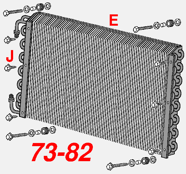 | J 73-82 CONDENSER 22 PIECE MOUNTING KIT includes 6 hex washer head tapping screws to mount the condenser to the mounting brackets, plus 2 hex head bolts to mount the upper brackets to the support & 2 indented hex washer head tapping screws with starter points to mount lower brackets to the radiator support. Also includes 8 SAE flat washers, 4 cushions & 4 spacers for the upper & lower mounts. Does 1 car. | |