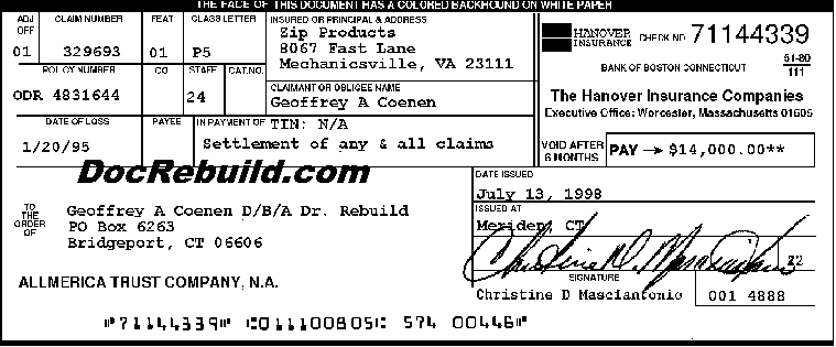 ZIP PRODUCTS pays Dr REBUILD a total of $70,000. Shown below one check for $14,000. on July 13, 1998. The Next Page shows another check from ZIP PRODUCTS for $ 56,000. more.